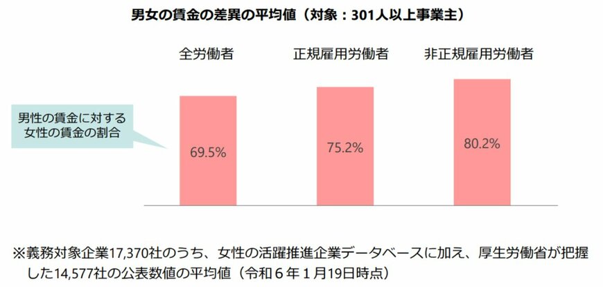 全労働者のデータによると、男性の賃金に対する女性の賃金の割合は69.5%で、女性は明らかに男性より賃金が低いことが示されています。