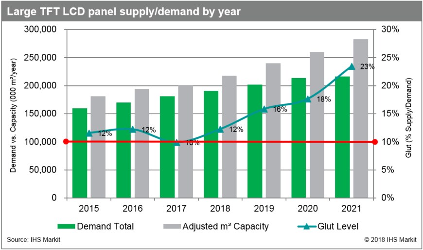 調査会社の英IHS Markitは、テレビ用液晶パネルの供給過剰により、最終的にマザーガラスサイズの小さい工場の再編が不可欠になるとの見通しを発表した。需給をバランス化するには複数の第5世代(5G)、6G、そして8G工場も停止する必要があるという。