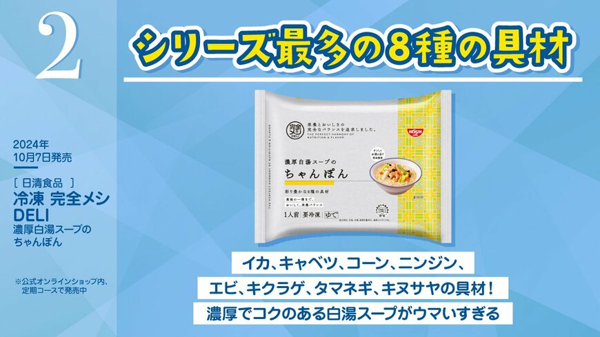 2022年の発売からシリーズ累計出荷数が3千万食を突破した「完全メシ」ブランド(*2)。10月に発売された冷凍 完全メシ DELI 濃厚白湯スープのちゃんぽんは、冷凍 完全メシシリーズでは最多となる8種の具材がトッピングされた見た目にもおいしい商品。