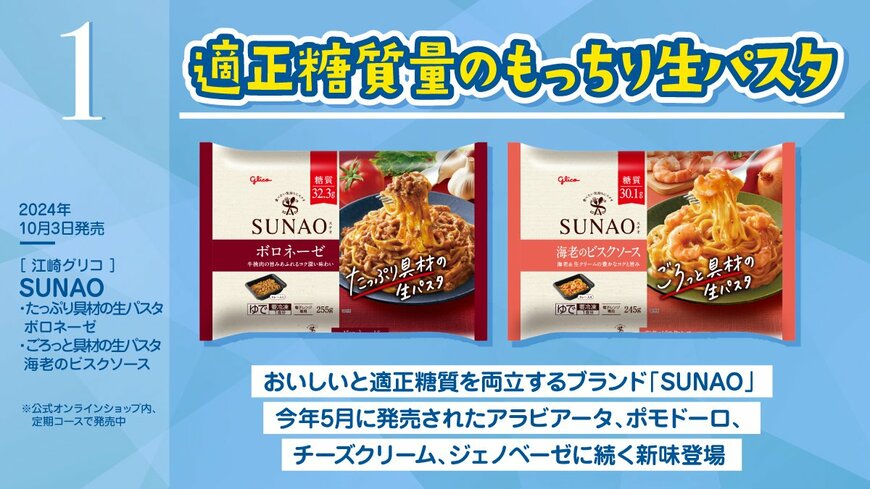 【10月発売の冷凍食品 その1】江崎グリコ SUNAO冷凍生パスタシリーズ