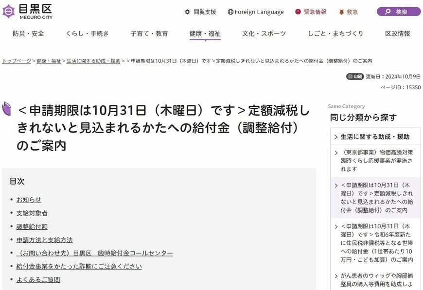 - 目黒区「定額減税しきれないと見込まれるかたへの給付金(調整給付)のご案内」