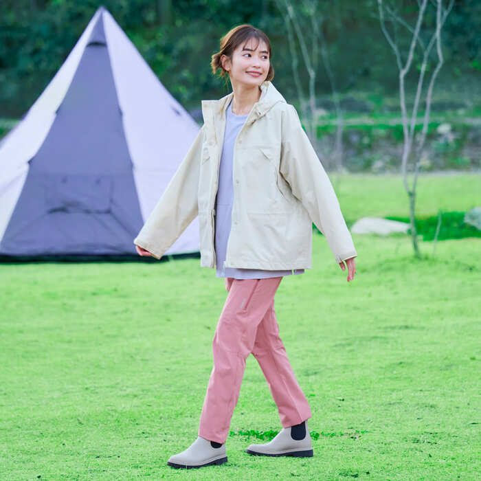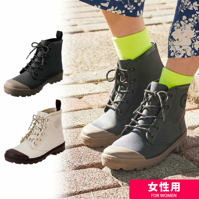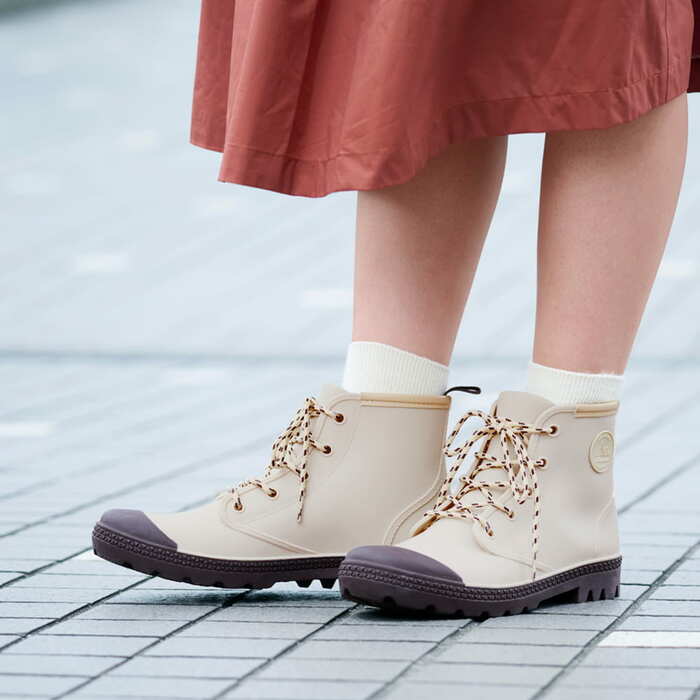 こちらの防水サファリシューズは、長靴っぽさがなく、デイリーユースしやすいデザインのため、雨が上がったあとでも違和感なく履き続けられます。履き口に合皮が巻かれており、長時間の使用でも足が痛くなる心配もいりません。女性らしさのあるカラーバリエーションもうれしいですね。