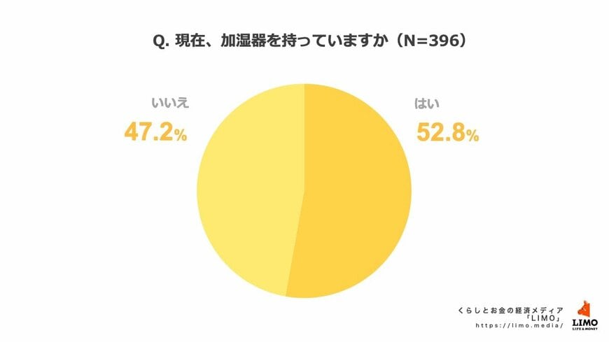 52.8%が加湿器を所有している一方で、47.2%は所有していないことがわかりました。加湿器の所有状況はほぼ半数ずつに分かれ、拮抗していると言えます。