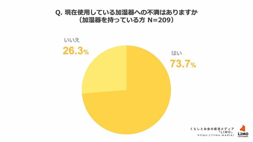 209名の回答者のうち154名が「はい」と答え、 約7割が現在使用している加湿器に何かしらの不満を感じているという結果になりました。