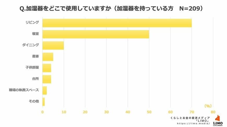 加湿器を持っていると回答した方を対象に、加湿器をどこで使用しているかを調査したところ、結果は以下の通りとなりました。