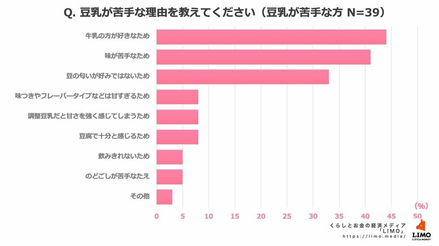 豆乳が苦手と答えた方を対象に、苦手な理由を聞いたところ、結果は以下の通りとなりました。