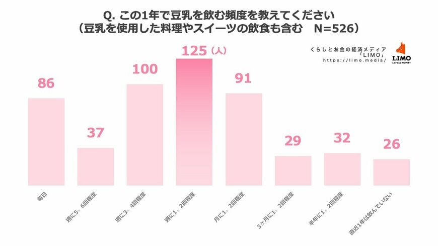 豆乳を飲む頻度について、この1年間で豆乳を使用した料理やスイーツの飲食も含めて質問したところ、以下の結果となりました。