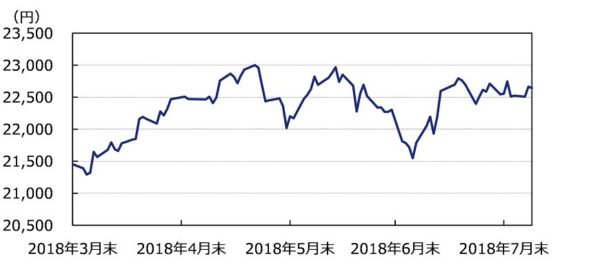 - 8月10日に2018年4~6月期の国内総生産(以下、GDP)速報値が、内閣府から発表された。前期比年率の実質値は1.9%増(ブルームバーグ予想値1.4%増)と堅調な数字。一方で、足元までの日経平均株価は22,500円近辺での膠着状態と評価できると考えている。
