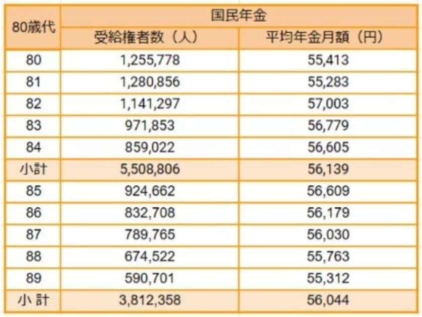 2. 【国民年金の一覧表】】60~89歳までの平均月額