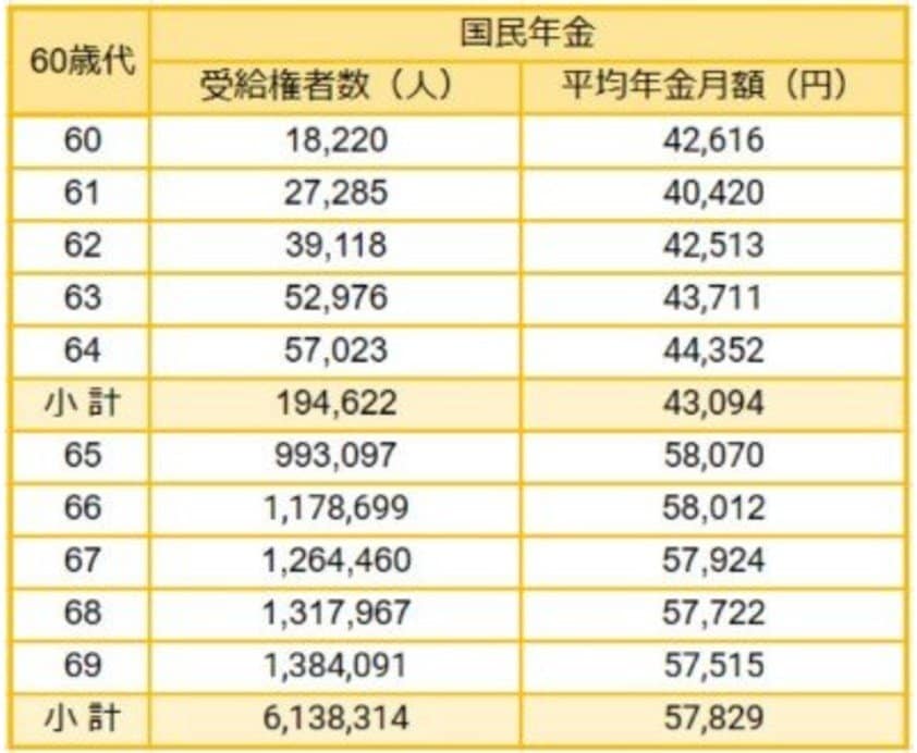 国民年金の平均月額は年齢によって大きな差はなく、概ね5万円台の受給額となっています。