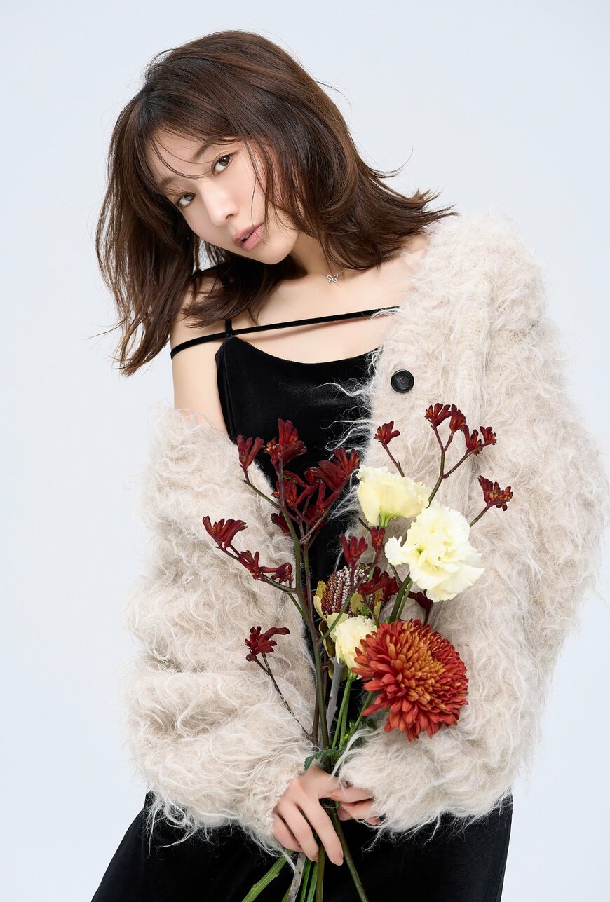 2枚目は毛足の長いふわもこなニットカーディガンから、黒のキャミワンピースで肩やデコルテを露出。大人の色気あふれるコーディネートです。ラフなヘアセットに流し目が印象的で、手に持った赤と白を基調にした花束がホリデーシーズンの気分をあげてくれますね。
