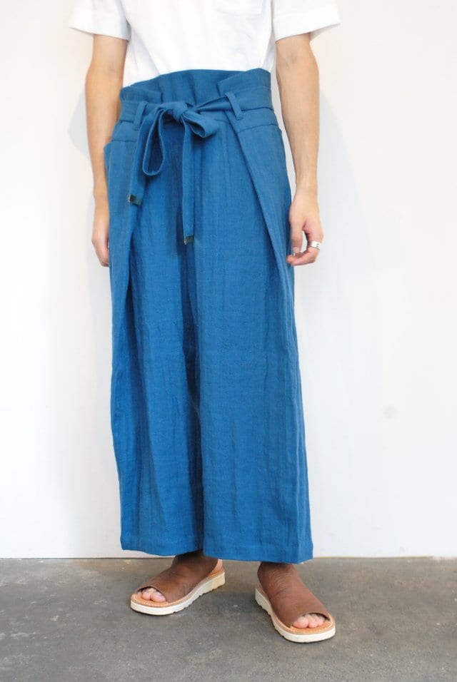 タイパンツを思わせるような、ウエストに合わせて両端にたたんで穿くデザインのマキパンツ。巻き方やひもの通し方によって自分らしくアレンジできるところが魅力です。