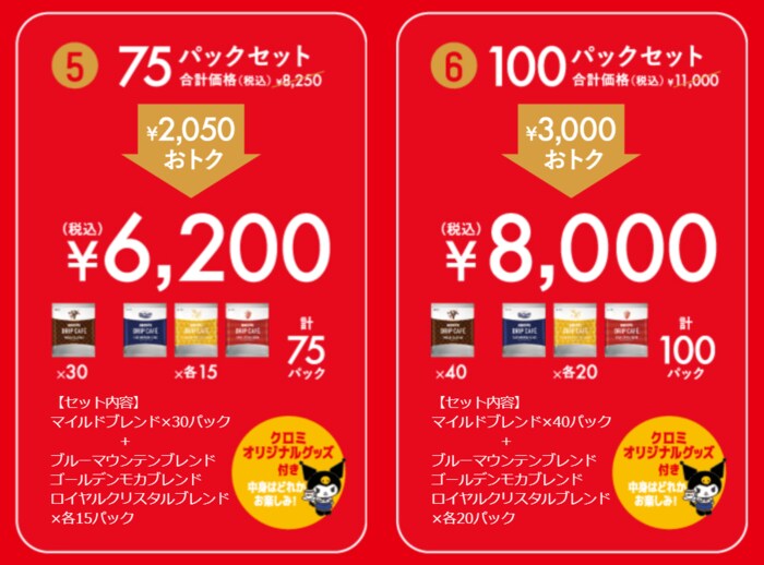 - セット内容:マイルドブレンド×40パック、ブルーマウンテンブレンド×20パック、ゴールデンモカブレンド×20パック、ロイヤルクリスタルブレンド×20パック