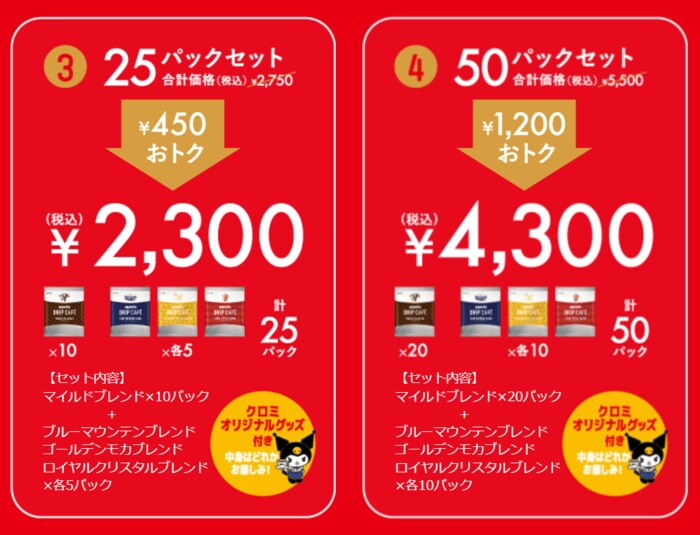 - セット内容:マイルドブレンド×10パック、ブルーマウンテンブレンド×5パック、ゴールデンモカブレンド×5パック、ロイヤルクリスタルブレンド×5パック