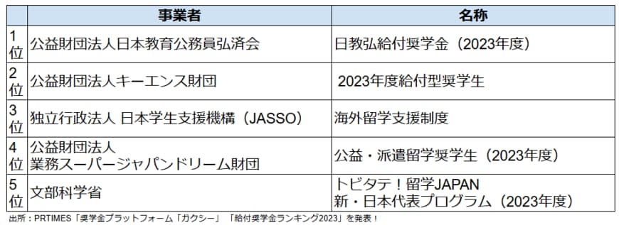 3. 【一覧表】2023年度「人気給付奨学金ランキング」ベスト5
