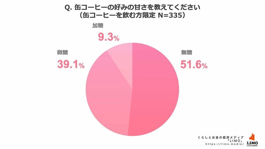 「無糖」が51.6%と過半数を占め、多くの方の人気を集めていることがわかりました。「微糖」は39.1%で、「加糖」は9.3%と少数派という結果に。健康志向の高まりから糖分摂取を控える方が増えていることや、コーヒー本来の風味を重視する方が増えていることが考えられます。