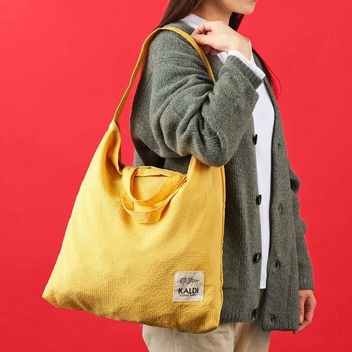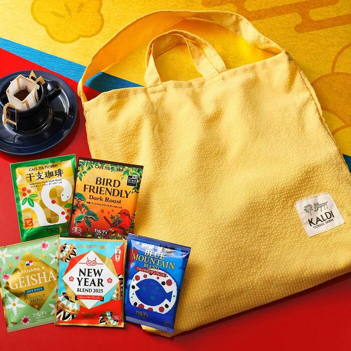カルディのドリップコーヒーが5種類28杯分も楽しめます。小分けになっているので持ち運びに便利。バッグは黄色のカラーが目を引く2wayエコバッグです。
