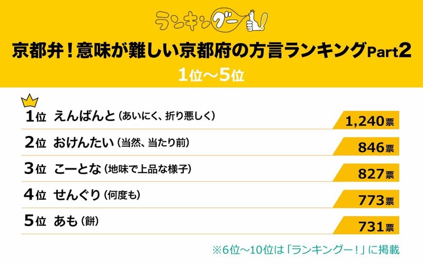 「意味が難しい京都府の方言ランキング」1~3位を紹介しました。「えんばんと」「おけんたい」「こーとな」、みなさんはいくつ知っていましたか?