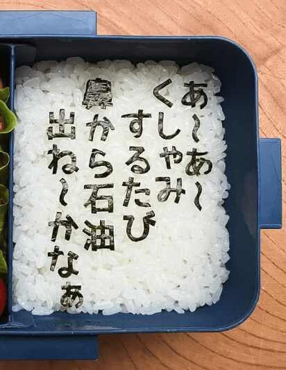 海苔で書かれたのは「あ~あ~くしゃみするたび鼻から石油出ね~かなぁ」の切実な思い。
