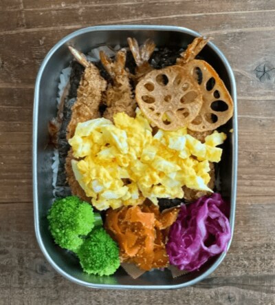 黄金色のタルタルが、お弁当の中央で輝きます。