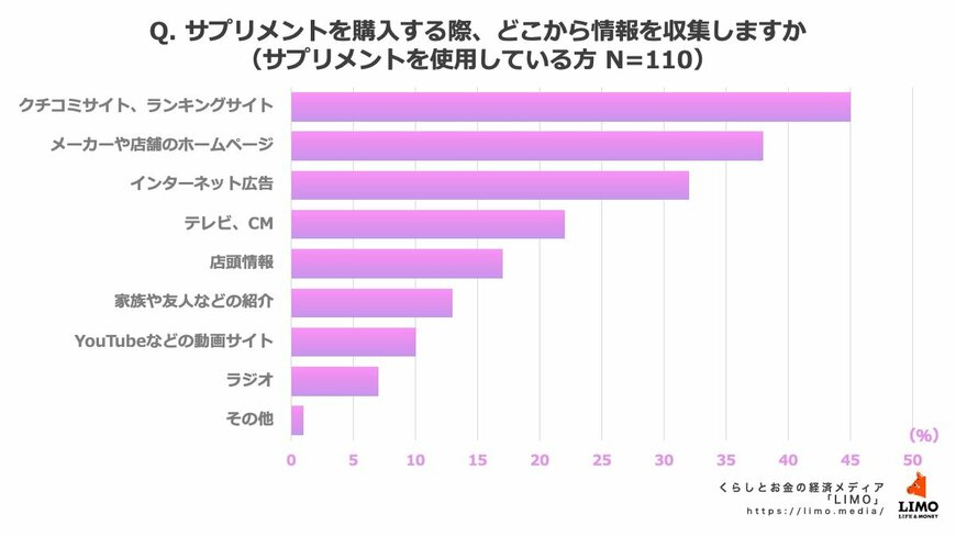 【サプリメントに関する独自調査】情報の収集場所は「クチコミサイト、ランキングサイト」が4割以上