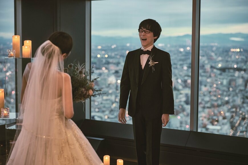 結婚式はまだ外の明るい夕方の時間帯から夜にかけて行われました。2人はキャンドルや花で装飾された都庁展望室に親族らを招待。2人はタキシード&ウエディングドレスに身を包み、ファーストミートや誓いの言葉代わりの手紙の交換、ランタンセレモニーなどのプログラムを行いました。