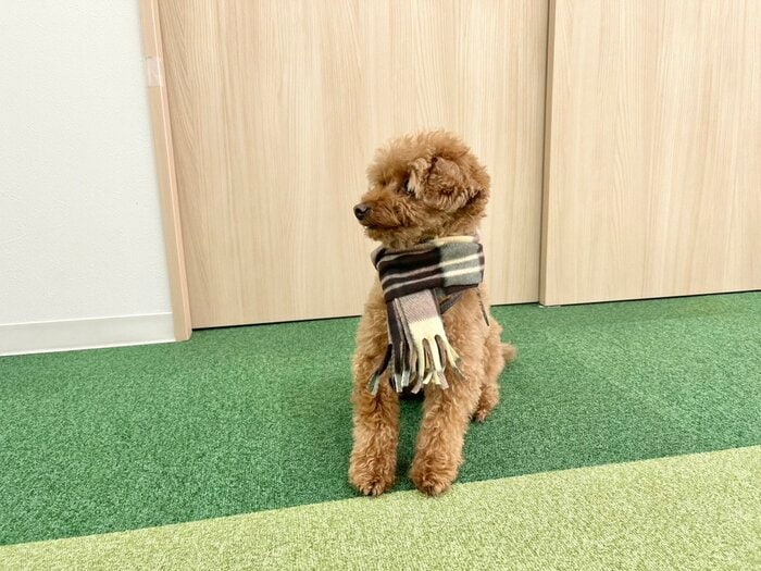 5. トイプードルが冬コーデに最適なマフラーを着用