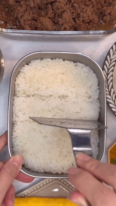 シンプルなお弁当箱に白米をしきつめたら、まずは各おかずを入れる場所と量をわかりやすくするため、へらなどで筋を入れておくのがコツのようです。