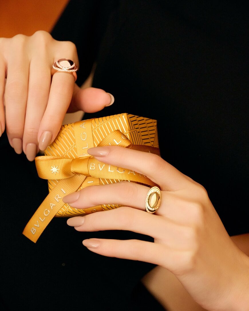 バッグ、時計、ネックレス、リング、ブレスレットと、ゴールドを基調にしたブルガリジュエリーをまとった森。