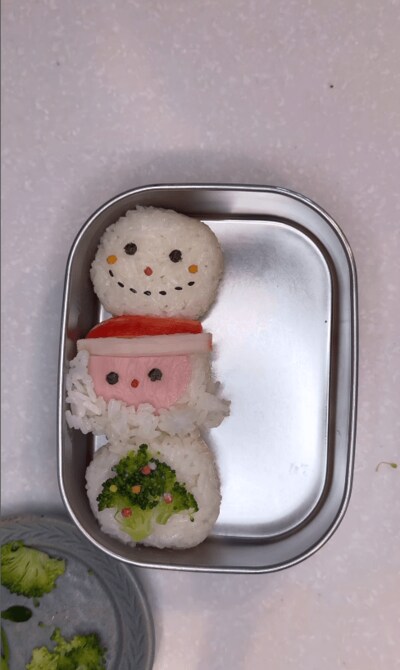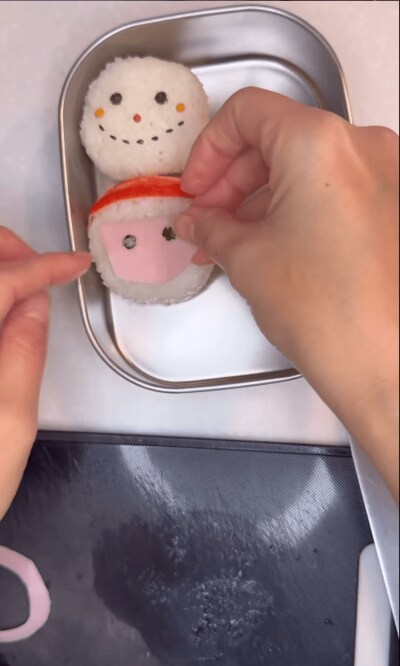 黒ゴマや海苔、ハムで雪だるまとサンタクロースの顔が出来上がりました。雪だるまのチークが、筆者が個人的には好きです。