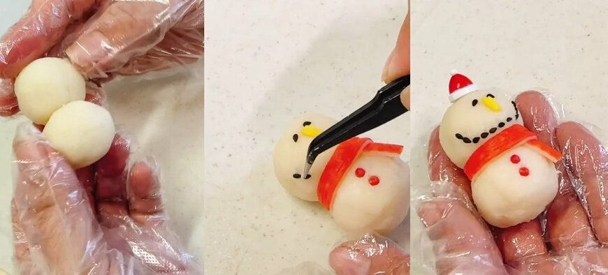 クリスマスにふさわしい雪だるまさん、かにかまや黒ゴマなどを駆使して、手際よく作っていきます。