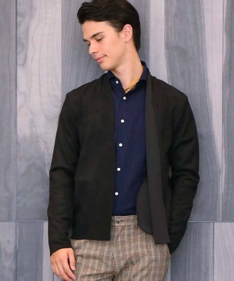 定番のニットではなく、フェイクスウェード素材で仕上げた『EDIFICE』のカーディガン。フロントボタンを配さないミニマルデザインで、同素材の品の良さを引き立てています。