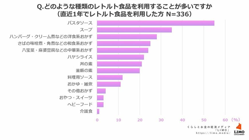 2位以下は「パスタソース」「スープ」と続いており、その次に各種おかずが続々とランクインしています。おかずよりは、カレーライスやパスタなど主食系のレトルト食品が多く利用されているという結果でした。