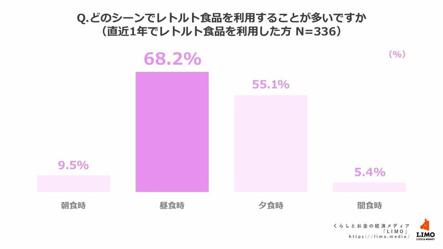 最も多かった回答は「昼食時」で68.2%でした。また、次に多かったのは「夕食時」で、55.1%とこちらも比較的高い数値に。昼食時・夕食時のどちらにおいてもレトルト食品が活躍していることが分かります。