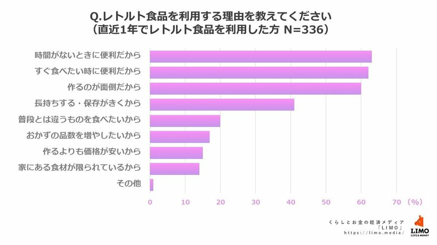 また、3位にランクインした回答は「作るのが面倒だから」で、こちらも59.5%と高い割合に。レトルト食品は味も美味しいものが多く「作るのは面倒だけど美味しい料理を食べたい」というニーズにもマッチしていることが伺えます。
