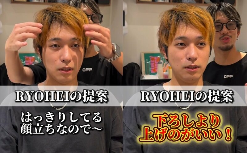 男性は前髪を下ろしたスタイルを希望されていたようですが、目が大きく、はっきりしたお顔立ちの男性を見て、RYOHEIさんは「髪を下ろすより、上げたほうが似合う!」と判断。