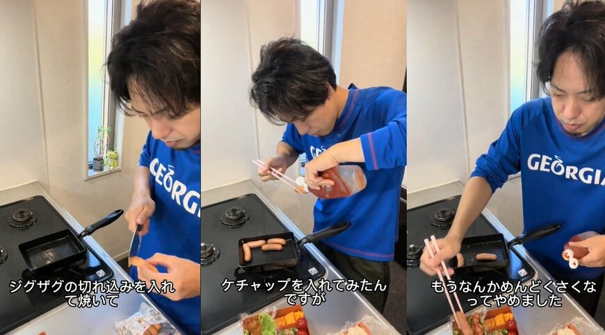 ネットで「ウィンナーにジグザグの切れ込みを入れて焼き、その切れ込みにケチャップをいれると、隣のおかずにケチャップがつかない」という裏技情報をゲットし、この日試してみたヤギさん。