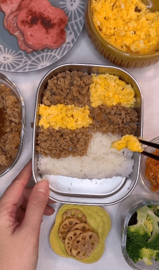 2. 【お花ソーセージ弁当】線を目安に卵とそぼろをONしていきます!