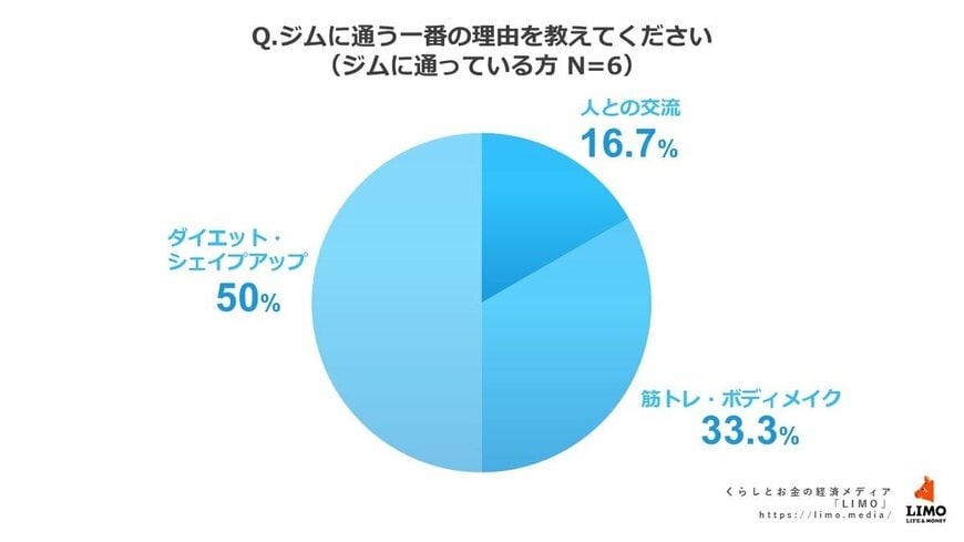 6人中3人が「ダイエット・シェイプアップ」、2人が「筋トレ・ボディメイク」、1人が「人との交流」と回答しました。交流のためにジムを利用する方がいらっしゃるという点は、少し意外に感じる方もいらっしゃるかもしれません。