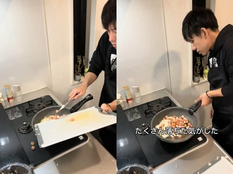 冒頭はその様子をとらえた動画ですが、ウィンナーの鮮度が良すぎてフライパンから大量に飛び出るハプニング!