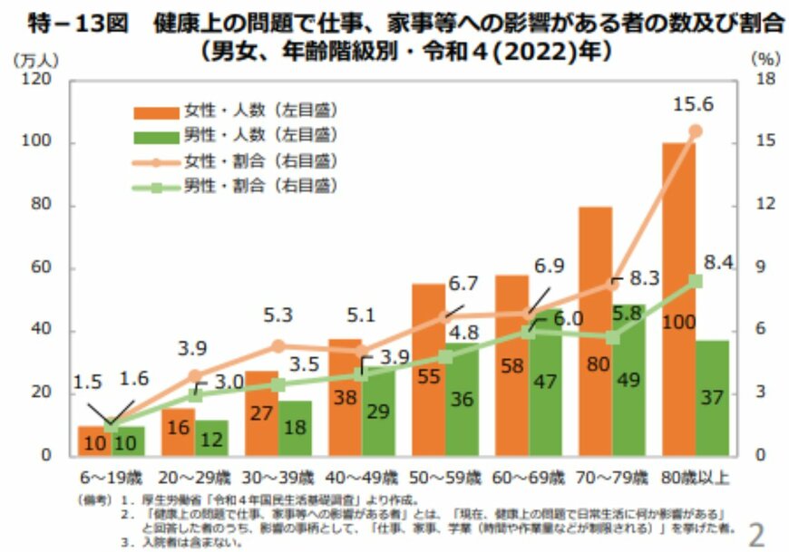 グラフからは、年齢が上がるにつれて健康上の問題によって仕事や家事が難しくなる人が増加していることが見て取れます。