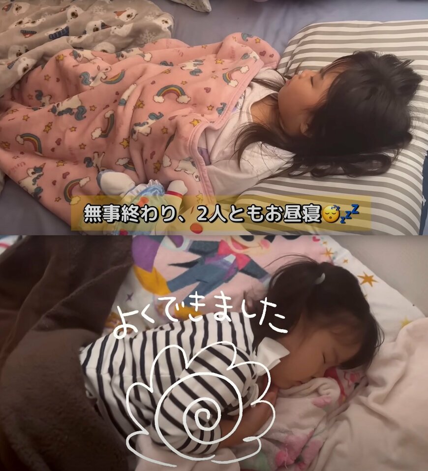 そして無事健診も終わり。ついてきてくれたおりなちゃん、かがりちゃん2人一緒にお昼寝しています。