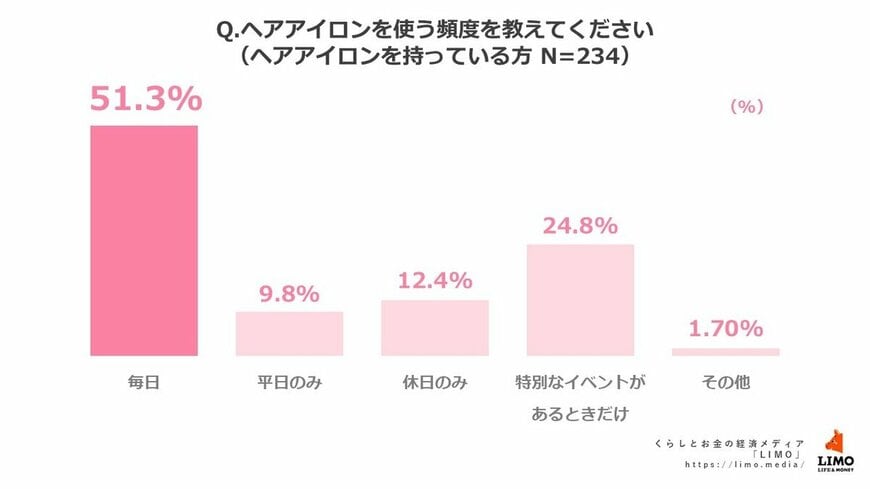 次点で多かったのが「特別なイベントがあるときだけ」という回答で、24.8%に。やはり大事なイベントに参加する際は、身だしなみをきちんと整えておきたいもの。ヘアアイロンを使って、アレンジを楽しむ方も多いのではないでしょうか。
