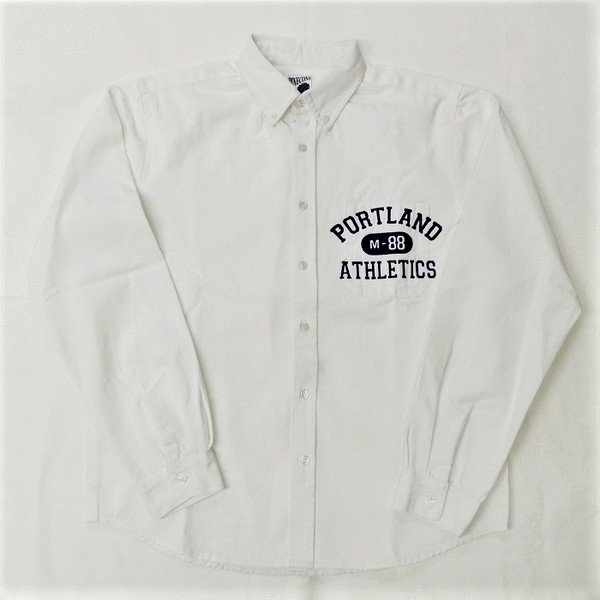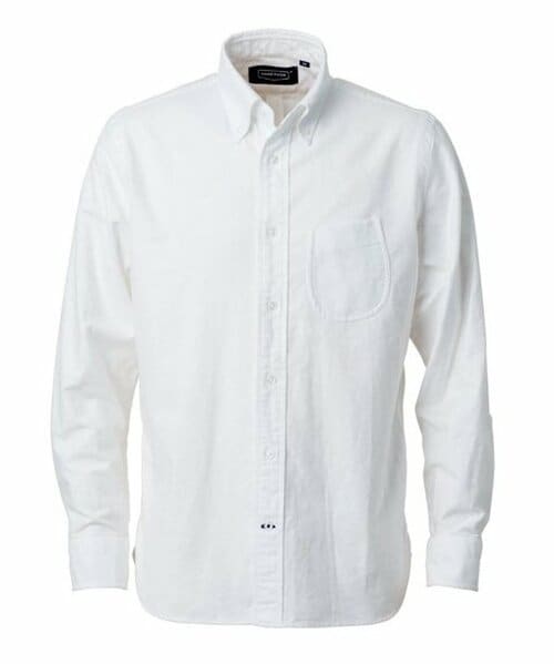 『PINECONE』のボタンダウンシャツは、ダミーの胸ポケ上に施されたカレッジライクな刺繍が魅力的な一枚。しっかりとした生地感のツイル素材や3本針縫製など、随所にワークシャツの要素を取り入れた一捻りあるデザインは見落としてはいけないポイントです。