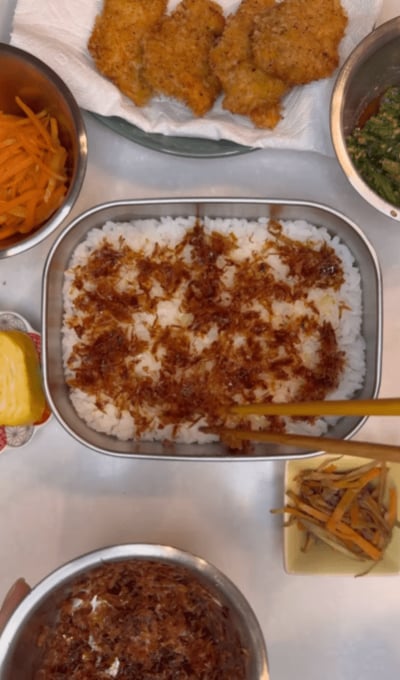 saoriさんは、海苔弁当だけでも十分に美味しく味わえるよう、おかか醬油を白いご飯の上に散らします。おかか醬油、美味しいですよね!