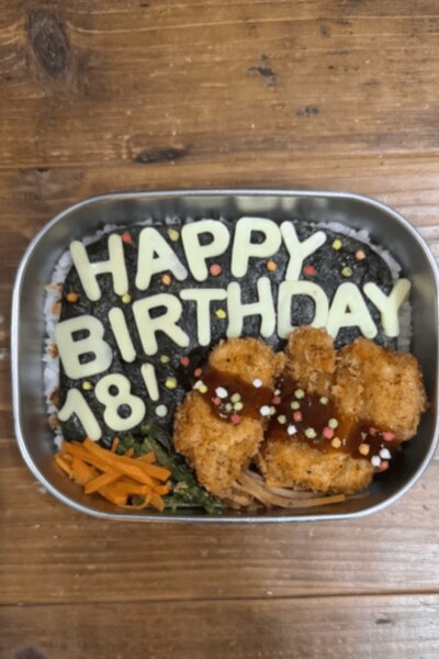 ハッピーバースデーのメッセージの他に、フライがお野菜が乗ったお誕生日感満載のお弁当。