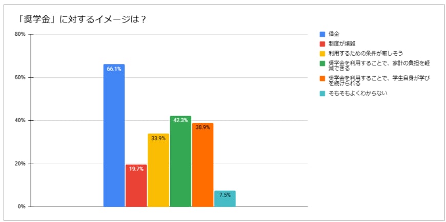 現在では返済不要の「給付型奨学金」なども徐々に増えつつありますが、まだまだ「学校に行くために借りるお金」というイメージを持つ人がまだまだ多いことが伺えます。