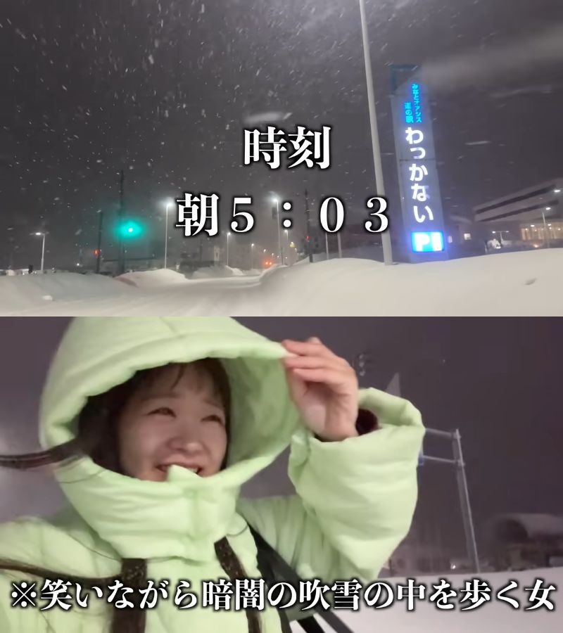 夜が明けて朝の5時頃。吹雪で氷点下0.3度の荒天の中、果林さんは稚内駅へと向かいます。人生初めての吹雪に思わず笑みがこぼれます。雪景色にパステルグリーンのダウンが映えますね。