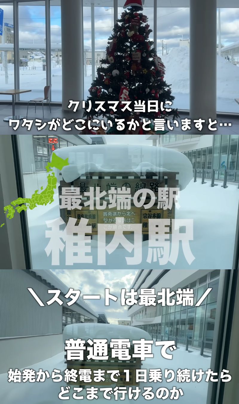 世間が温かいクリスマスを送っているであろう12月25日、日本最北端の駅・稚内駅に降り立った果林さん。リニューアルした「青春18きっぷ」を手に、26日の始発から終電まで、普通列車に乗り続けたらどこまで到達できるか検証しています。