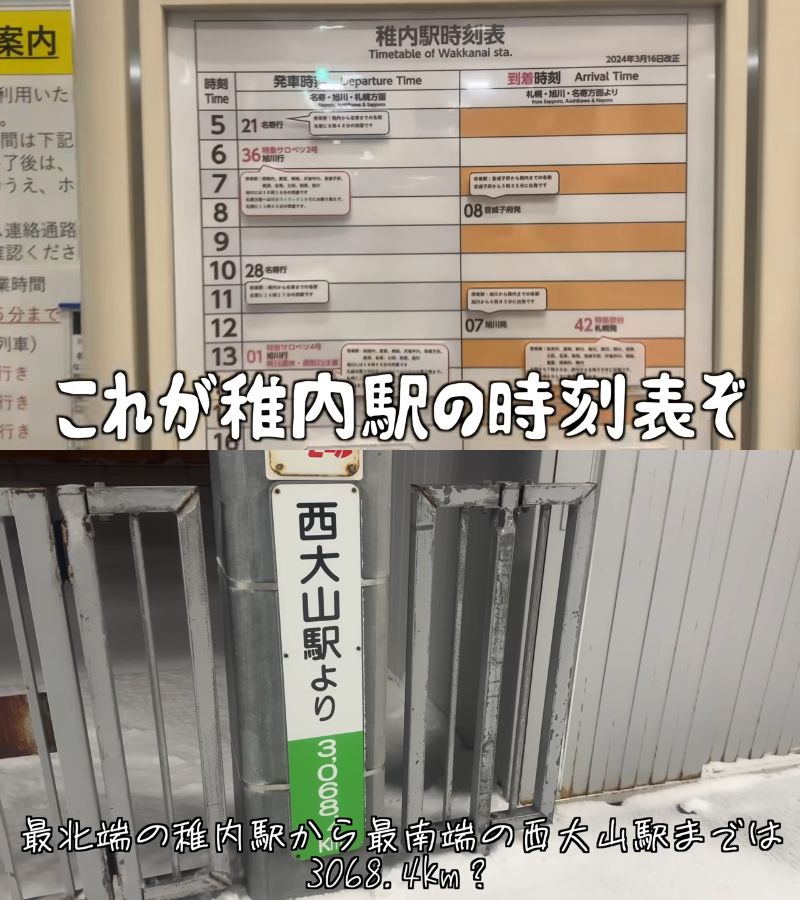 JR日本最南端の駅である、鹿児島県の西大山駅まではなんと3068.4キロ。数字が大きすぎてなかなかイメージがつきませんね。